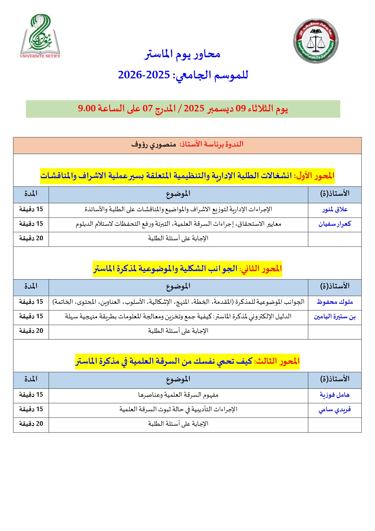 ليكـــــــن في علم طلبة السنة الثانيـــــة ماستر حقــوق وعلوم سيــــــاسيــــــــــة (جميع التخصصات) أنهم معنيون بحضور يوم بيداغوجي مفتوح والموسوم بــــ: توجيهات بيــــــداغوجية وإداريـــــــــة حول مذكرة التـــــخرج، والمقرر يوم الثلاثاء 09 ديسمبر 2025 على الساعة 9.00 صباحا وذلك بـــــ: المدرج رقم 07(قسمي الحقوق والعلوم السياسية).